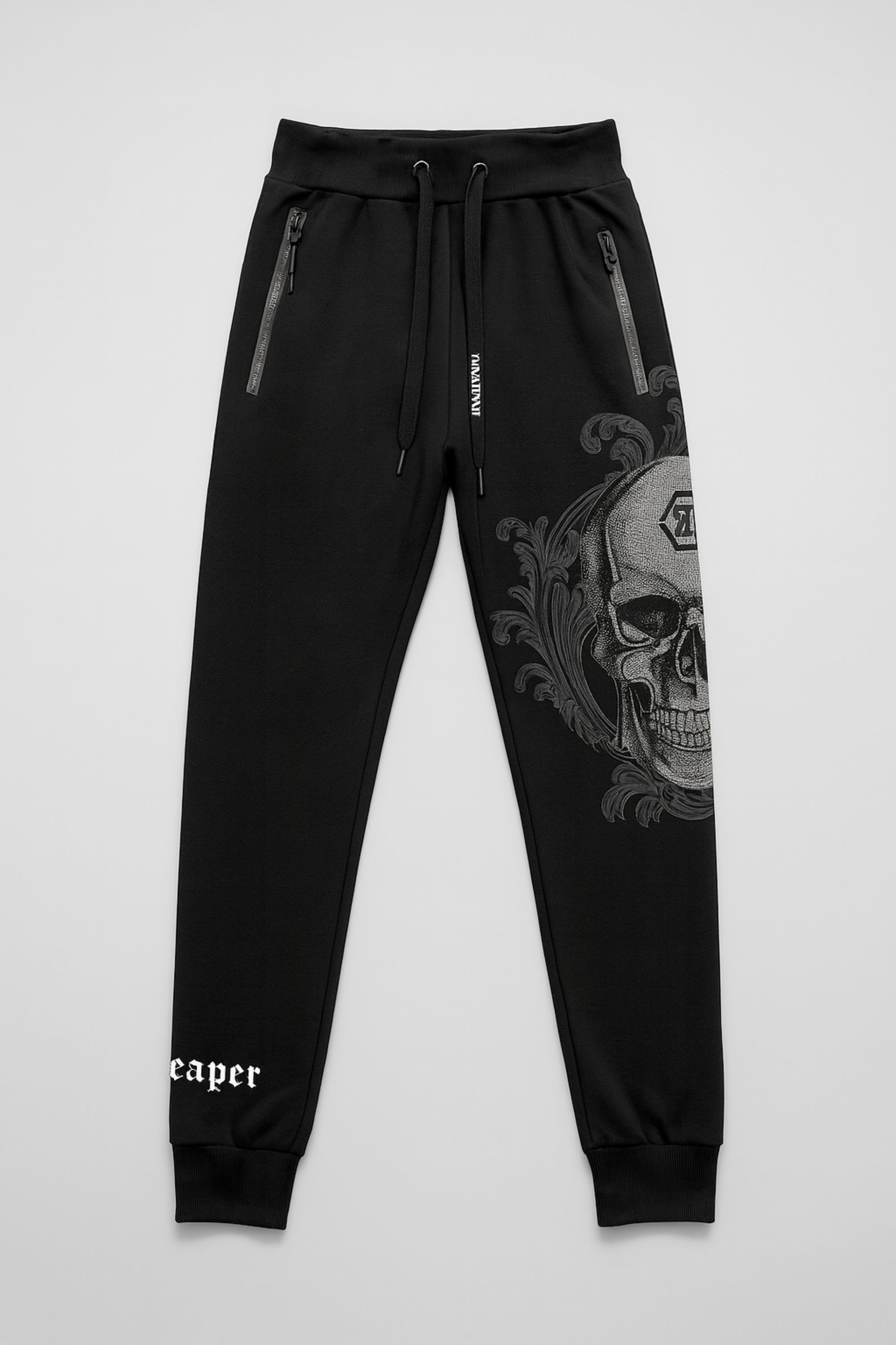 Men's black sweatpants with distinctive rhinestone decoration. On the side of the thigh, a skull decorated with rhinestones extends to the back. Text print on one cuff and decorative seams. Two front pockets with zippers. Elastic waistband with drawstring. Ribbed cuffs.