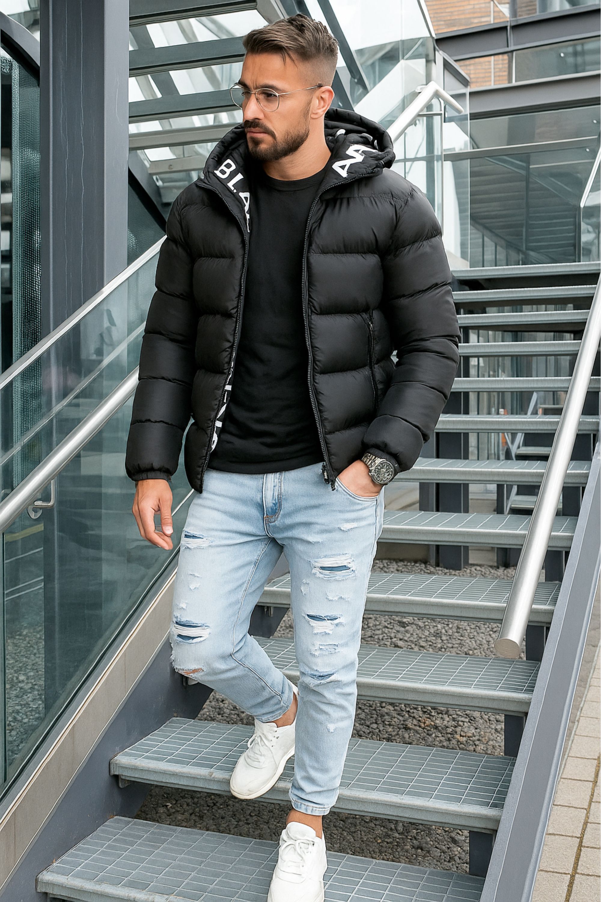 - Breadcrumbs Home Mens JacketsMen's Winter Jackets Black warm winter coat with text print JERONE