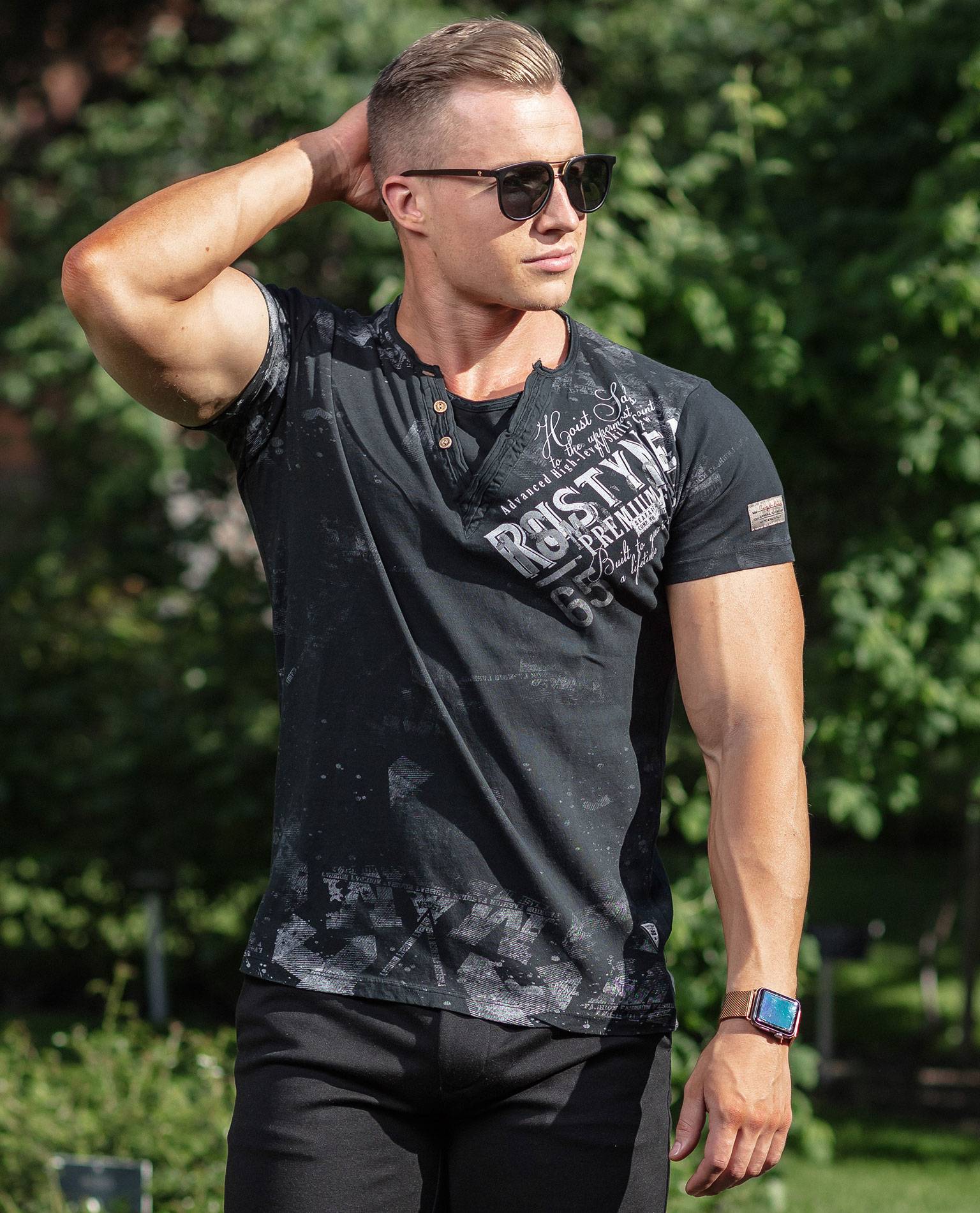 RUSTY NEAL black t-shirt. Neat print on the front and sleeves. Logo printing on the sleeve. Decorative buttons at the neckline.