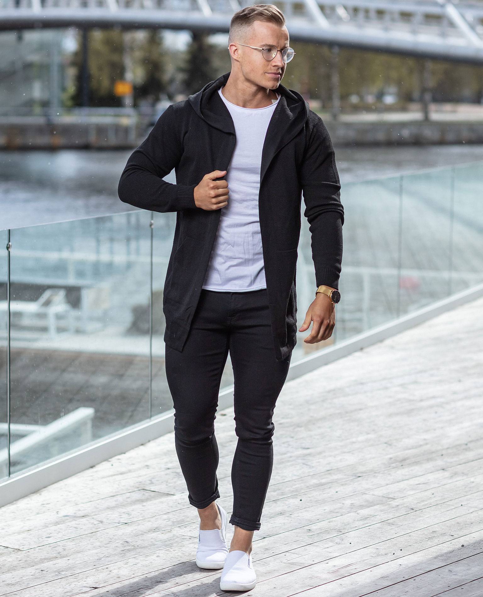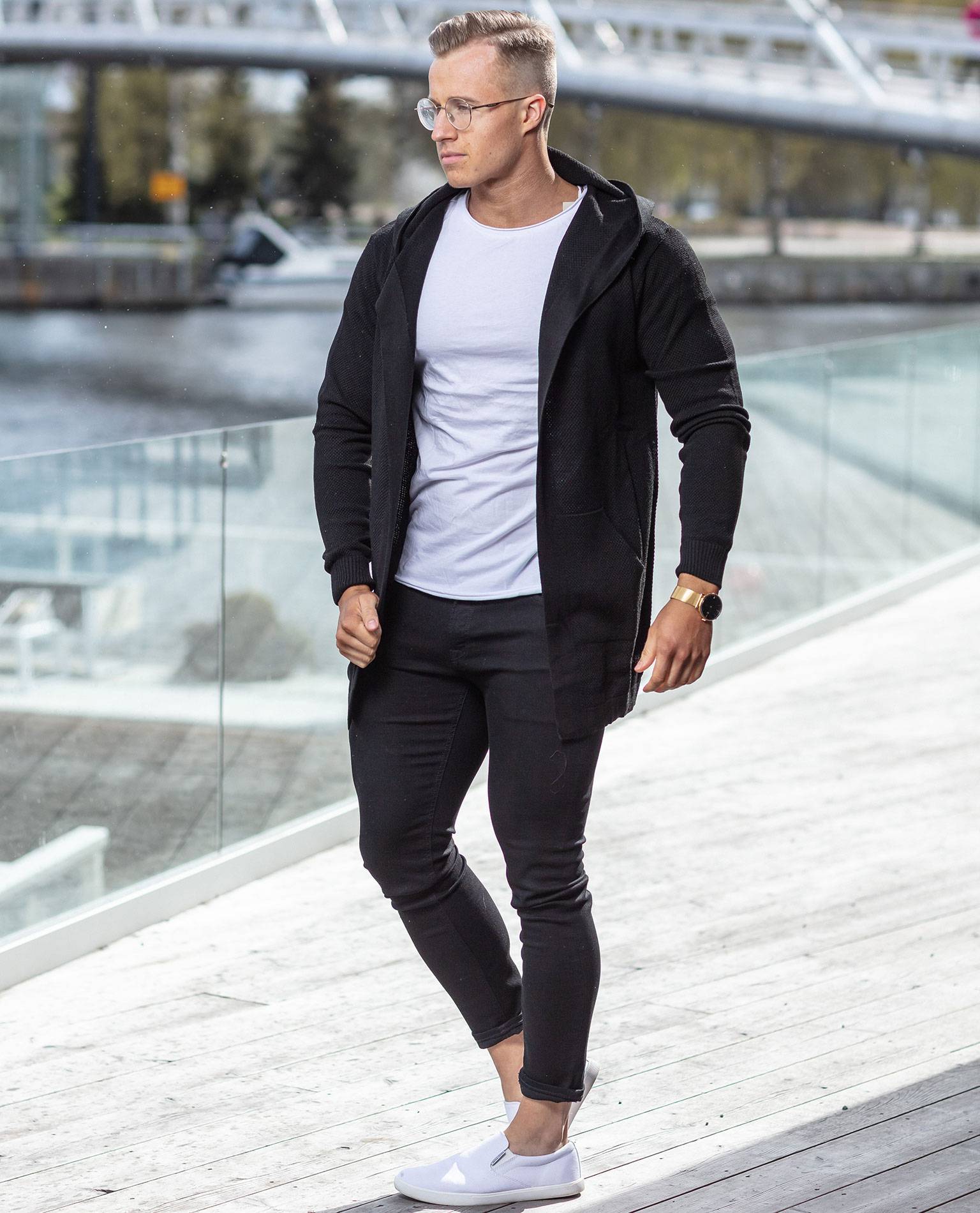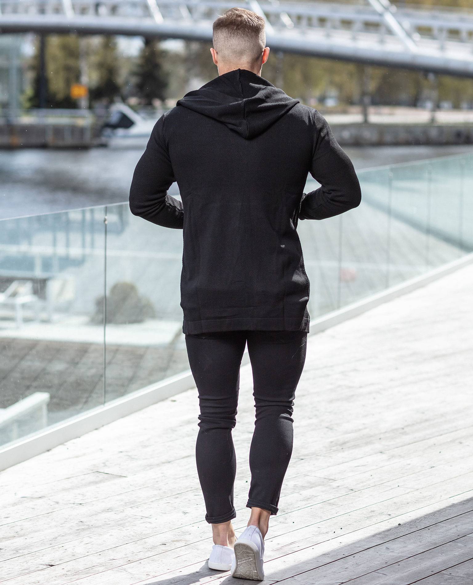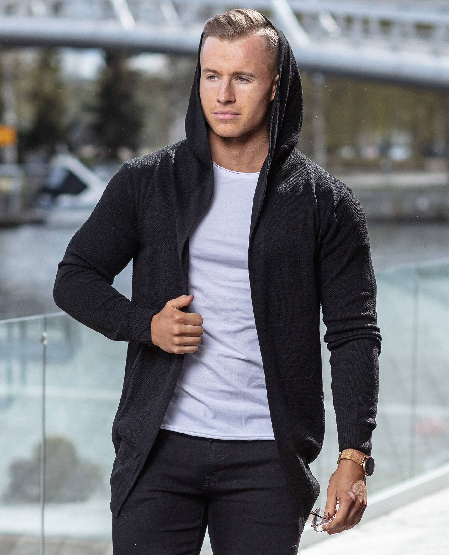 CARISMA black cardigan. Lightweight and thinner fabric, and open design at the front. Structured surface, hood. Trendy and timeless garment.